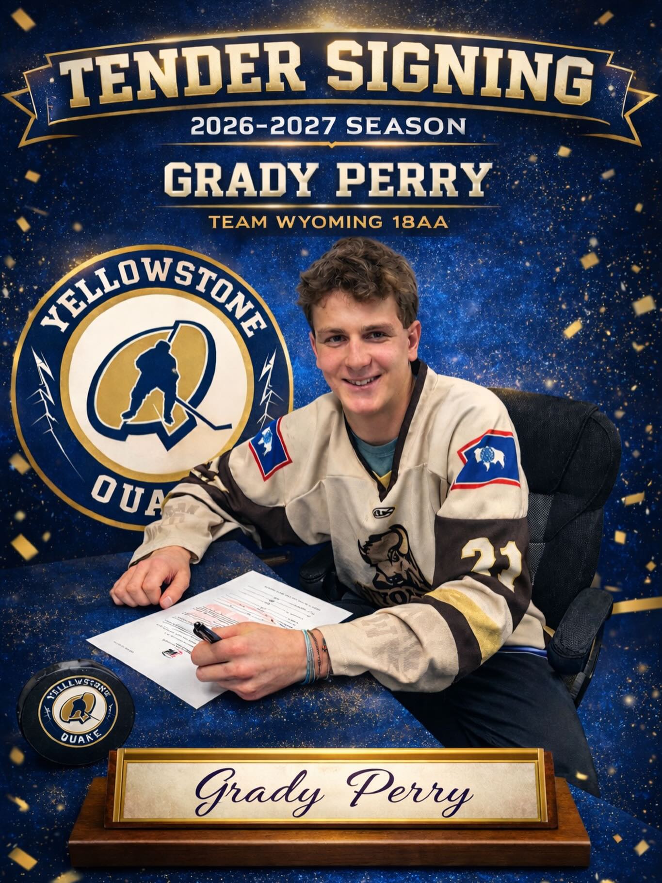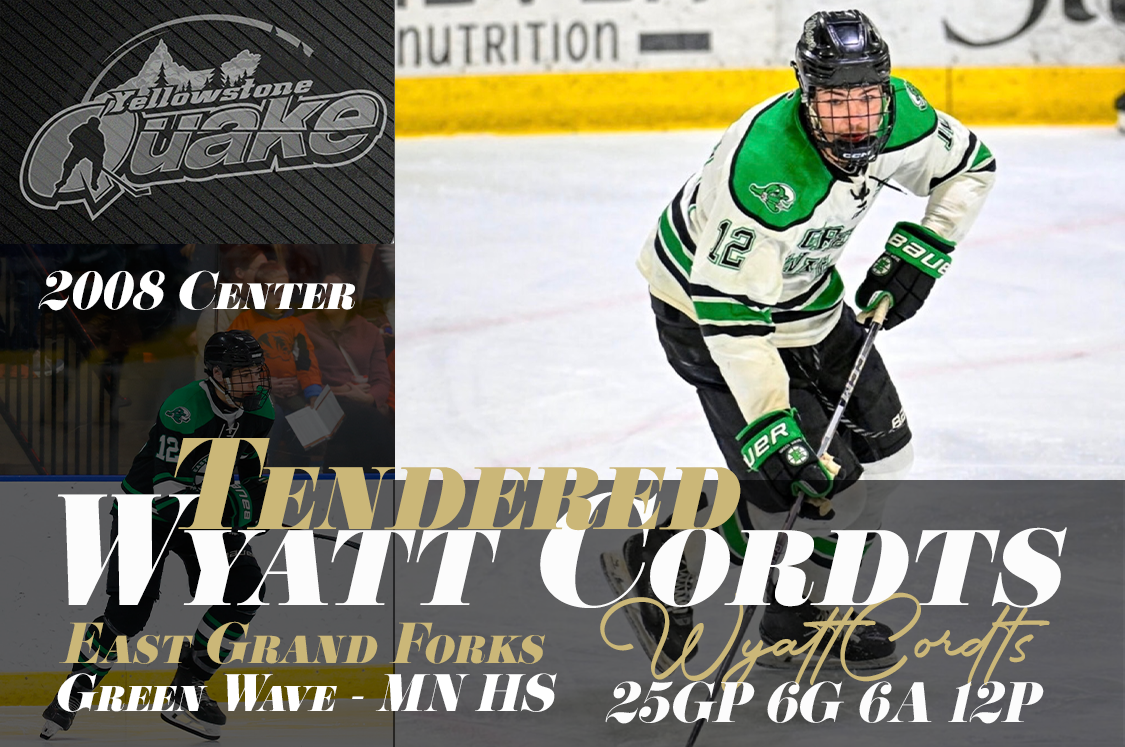 The Yellowstone Quake are excited to welcome 2008 center Wyatt Cordts to the organization. Wyatt joins us from East Grand Forks High School (MN), where he recorded 6 goals and 6 assists for 12 points in 25 games this season.Wyatt is a smart, competitive center who plays the game the right way. He brings good pace, strong hockey sense, and plays with an edge every shift. Weβre really excited about what he can become and believe heβs a great piece for the future of the Yellowstone Quake. Welcome to the Quake family, Wyatt.